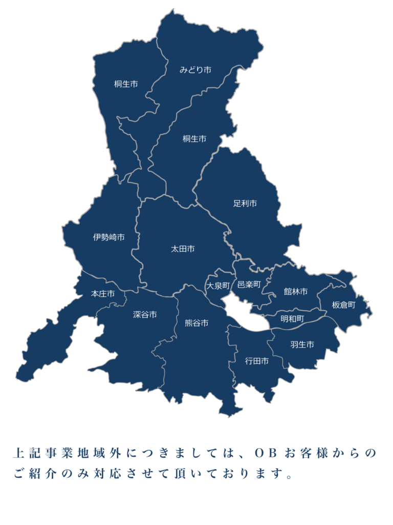 上記事業地域外につきましては、OBのお客様からのご紹介のみ対応させて頂いております。