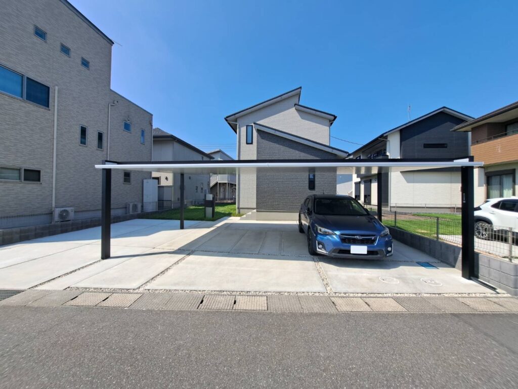 駐車場を大胆にリノベーションしたO様邸完成しました 外構工事後15年たち、土間コンクリートの汚れが気になると・・リフォームのご相談がありました🍀 3台用のカーポートは、周りで見かけた事が無い…と、天井裏が