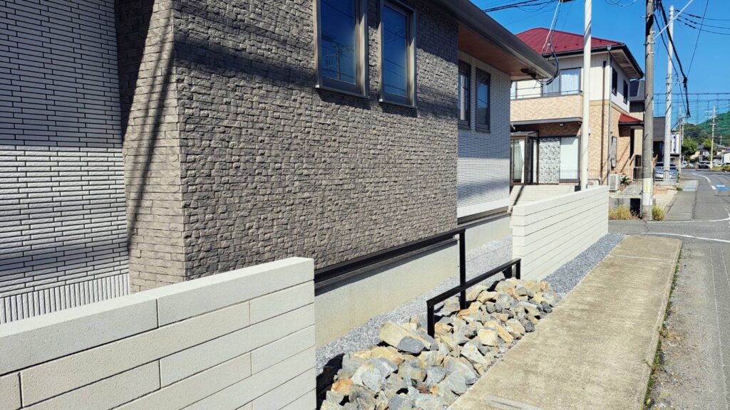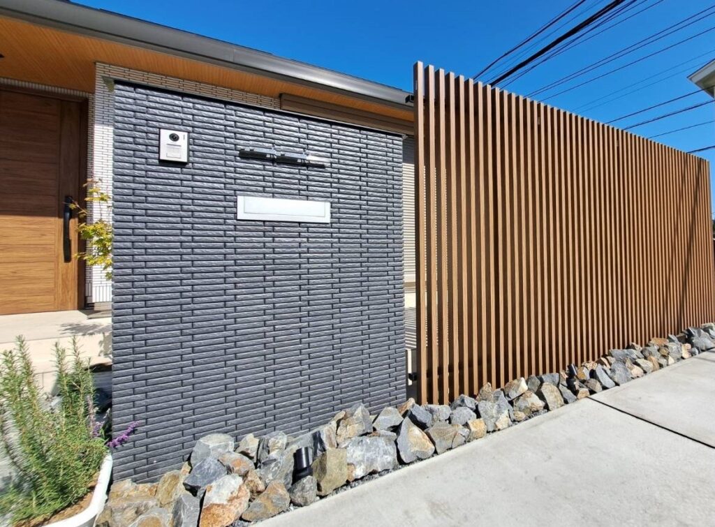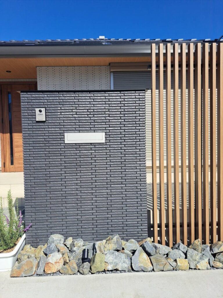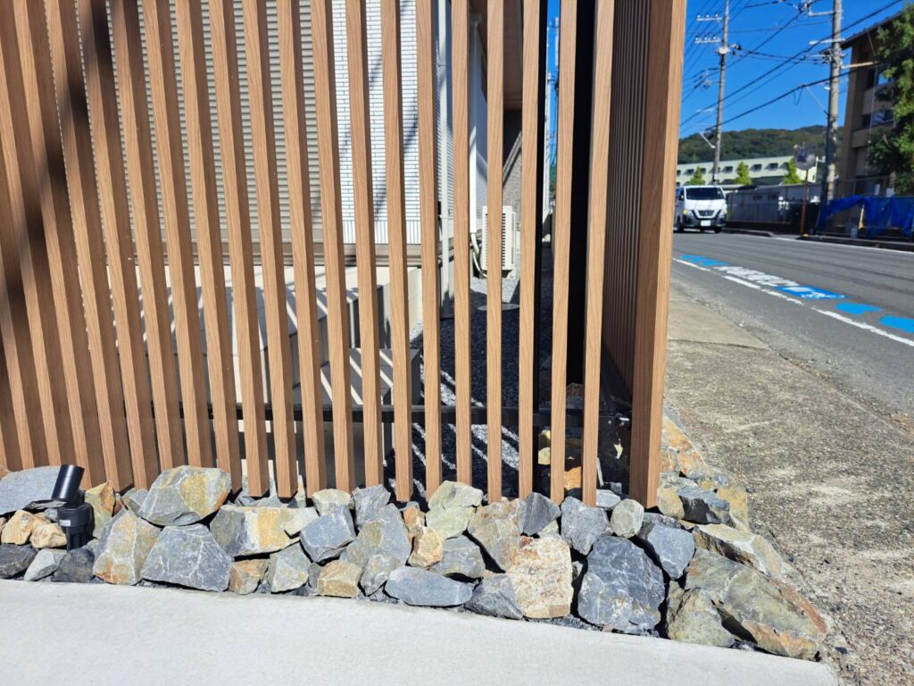 門壁と目隠しフェンスの足元には、ゴロタ石をアクセントに使用。
