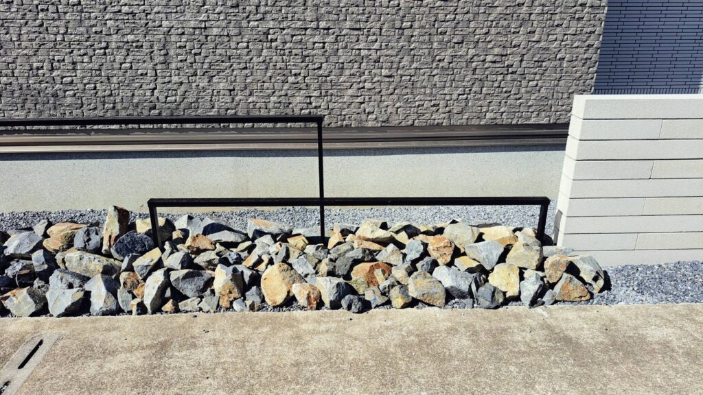 間にオブジェのようなフレームとゴロタ石をプラスし、抜け感を演出しました。