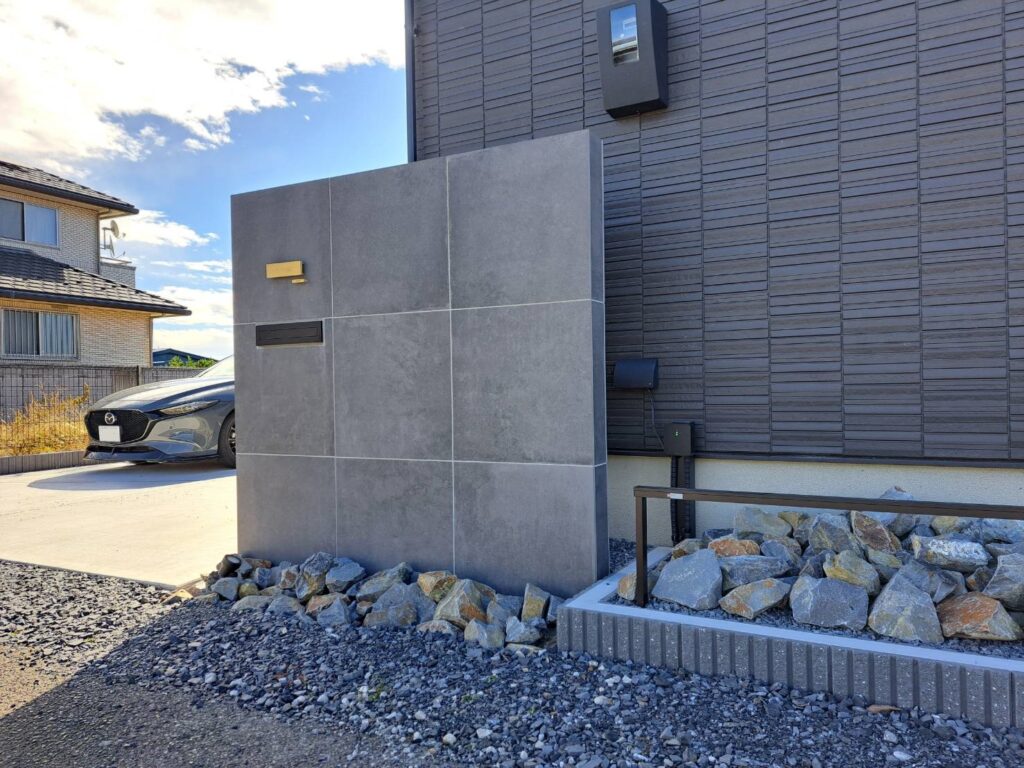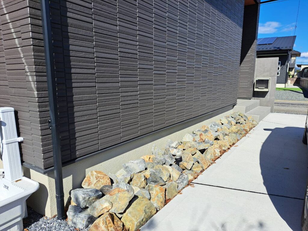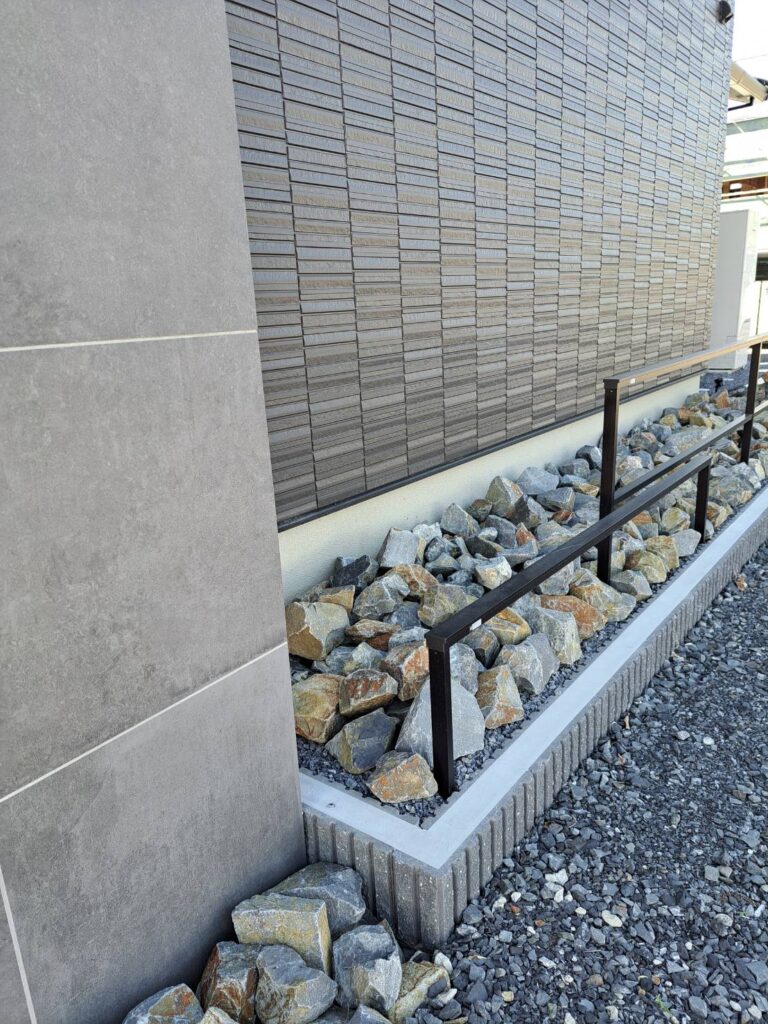 家の周りにゴロタ石を使い、彩やアクセントを演出✨