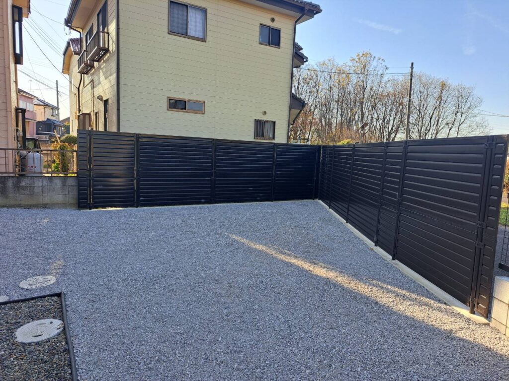既存フェンス前の広いスペースには、防草シートと6号砕石を丁寧に敷き込みました。