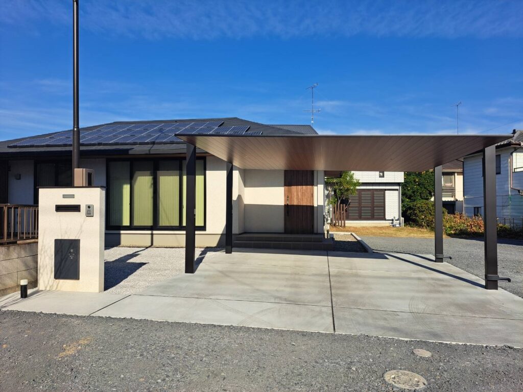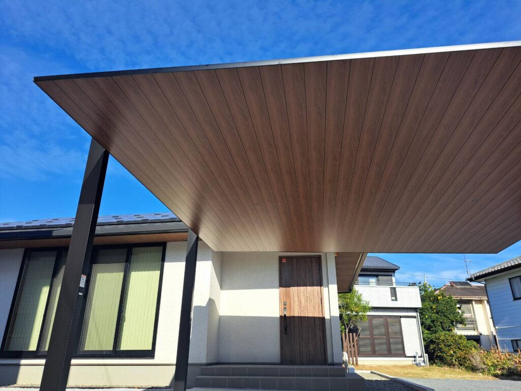 建物と調和する、ブラックと木目調のカーポートを設置。