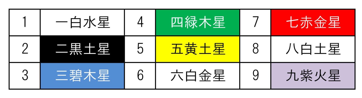 (例)1987年生まれ 1+9+8+7=25 2+5=7 11-7=4 四緑木星